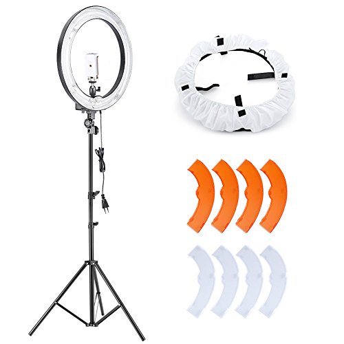 SONO INCLUSI NEL KIT: (1) 18”/48cm 75W 5500K Luce Anulare Dimmerabile, (1) Cavalletto Nero, (1) Diffusore, (1) Set Filtri Bianco & Giallo, (1) Testa a Sfera, (1) Supporto Clip per Smartphone. Il kit è perfetto per Youtube, Vine, ritratti, registrazioni video, illuminazione all'aperto, fotografia di moda, matrimoni e pubblicità ecc..