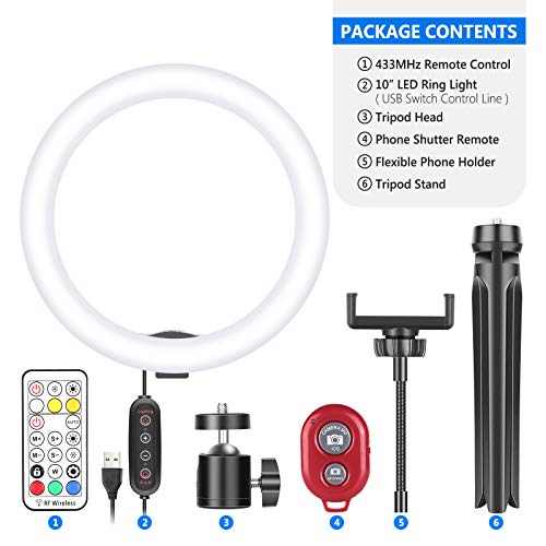 SONO INCLUSI NEL KIT: (1) 10” Luce Anulare RGB, (1) 433MHz Telecomando, (1) Stand da Tavolo, (1) Telecomando per Smartphone, (1) Supporto Clip per Smartphone, (1) Testa a Sfera con Coldshoe. ATTENZIONE: Lo smartphone NON è incluso! Il kit è molto applicato in varie occasioni come selfie, truccatura, blogger di bellezza, YouTube video, Twitter, Twitch, Snapchat, Facetime, TikTok, fotografia all'aperto, foto pubblicitarie e streaming in diretta ecc..