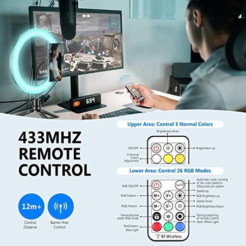 TELECOMANDO: La luce anulare è accompagnata da un telecomando 433MHz che è molto conveniente per regolare i colori RGB, la luminosità, l'accesione e lo spegnimento della luce. In modalità RGB, il tasto S+/- sul telecomando è in grado di regolare la velocità dinamica dei colori RGB. Inoltre, c'è un telecomando di scatto che può abbinarsi facilmente con lo smartphone, che è ideale per selfie e fotografia entro una distanza di circa 9 metri.