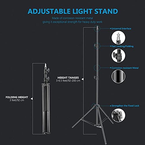 REGOLABILE CAVALLETTO: È realizzato in metallo resistente alla corrosione, che offre la robustezza eccezionale per i lavori pesanti. L'altezza si estende da 92cm a 200cm. La serratura solida garantisce la sicurezza degli impianti durante il lavoro. Una borsa di trasporto grande è inclusa per facilitare lo stoccaggio e il trasporto. La luce viene usata pure a mano tramite l'impugnatura in dotazione, e fissata sulla fotocamera via la testa a sfera con attacco hotshoe.