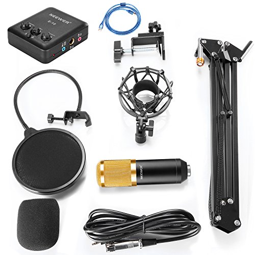 Neewer Kit di Microfono a Condensatore Professionale, Stand Asta di Sospensione Braccio a Forbici Regolabile, Supporto Anti-vibrazione e Scheda Audio a USB senza Driver con Volume Misto per Trasmissioni, Canto, Registrazioni (Dorato)