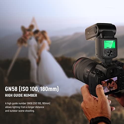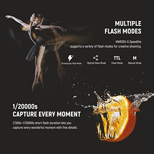 [Varie Modalità Flash] Questo NW635II-N speedlite supporta le modalità TTL, Manual, Optical Slave S1/S2 & flash stroboscopico, così come la compensazione dell'esposizione flash e le altre funzionalità. Il numero guida elevato GN58 (ISO100, 180mm) permette l'illuminazione da una distanza maggiore. Lo schermo LCD chiaro mostra tutte le informazioni necessarie per le precise impostazioni del flash.