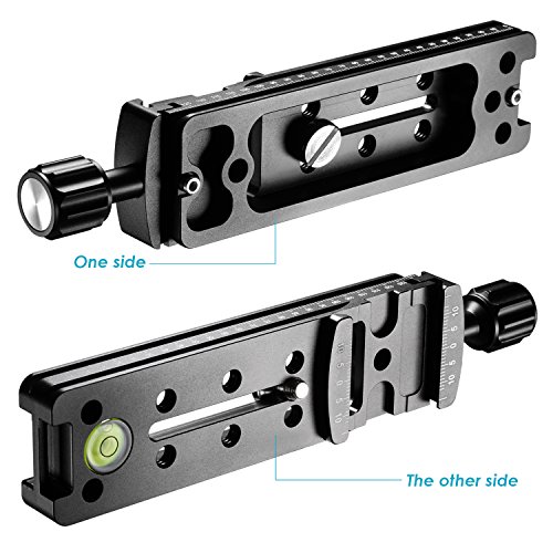 Questo multi-uso supporto rotaia scorrevole nodale con un pomello di sicurezza, compatibile con arca-swiss, ha dei segni di misurazione incisi a laser e una livella, è eccellente per la fotografia panoramica e di close-up.