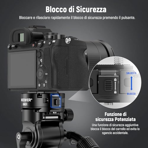 【Meccanismo di Bloccaggio Automatico】 Premere con forza la piastra a sgancio rapido montata sulla fotocamera nel morsetto, quindi il blocco della piastra a sgancio rapido scatterà automaticamente in posizione di "blocco" e fisserà la fotocamera in posizione.