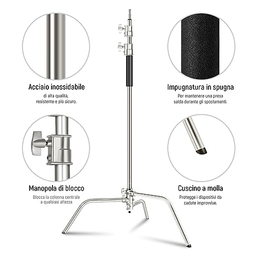 NEEWER C Stand Resistente in Pro 100% Acciaio inox con Cuscino d'Aria, 128cm Braccio d'Estensione e 2 Adattatore Grip Head, Stativo Fotografico Altezza Max 320cm, Supporto a C Stativo per Luci Video