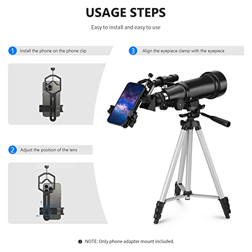 Facile da regolare: basta inserire il telefono nel supporto del telefono, centrare la fotocamera del telefono sopra l'oculare, regolare la posizione del supporto del telefono in base alla posizione della fotocamera del telefono e alle dimensioni del telefono con il pulsante di bloccaggio del supporto e utilizzare il pulsante di blocco superiore per fissarlo