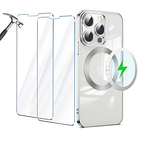 NEINEI Cover per iPhone 14 Pro (6.1”) Compatibile con Magsafe,Trasparente Placcatura Custodia con 2 Vetro Temperato + Protezione Fotocamera,Ultra Sottile Silicone Case Cover,Argento