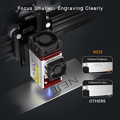 Sicuro e silenzioso: il motore intelligente regola la velocità della ventola in base alla temperatura del modello. Osram, diodo originale da 5,6 mm, di alta qualità, per garantire una lunga durata. L'obiettivo NEJE è una messa a fuoco chiara, nessuna luce diffusa, lunghezza focale regolabile.