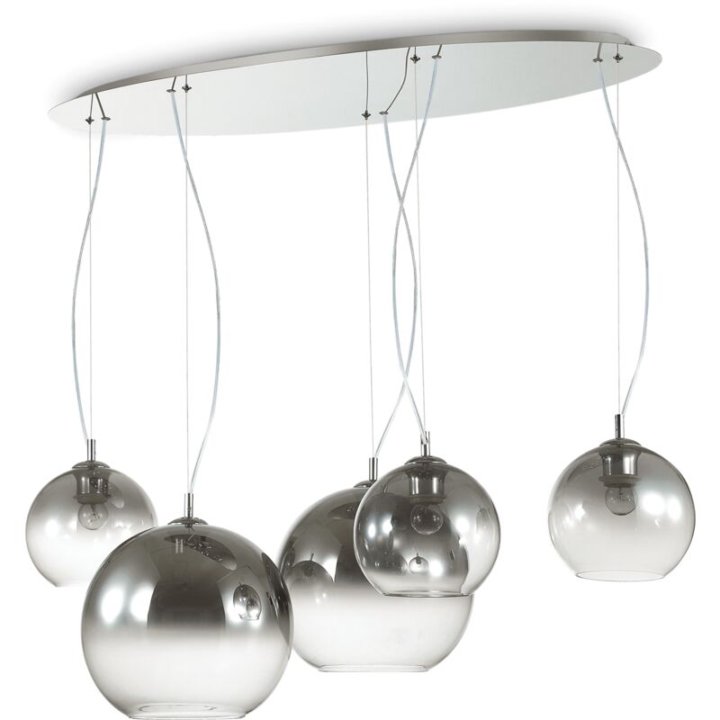 Montatura in cromo. Diffusore in vetro soffiato cromo sfumato. Sospensioni con cavo in acciaio a lunghezza regolabile da dispositivo ferma cavo automatico. L 107 x H min 42 / max 128,5 x P 60 cm E27 max 5 x 60W IP:20