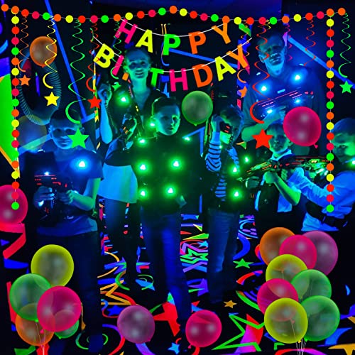 Contenuto della confezione: 6 nastri reattivi con luce nera UV, ghirlande di carta neon, striscioni di buon compleanno, 10 vortici da appendere, 25 palloncini fluorescenti