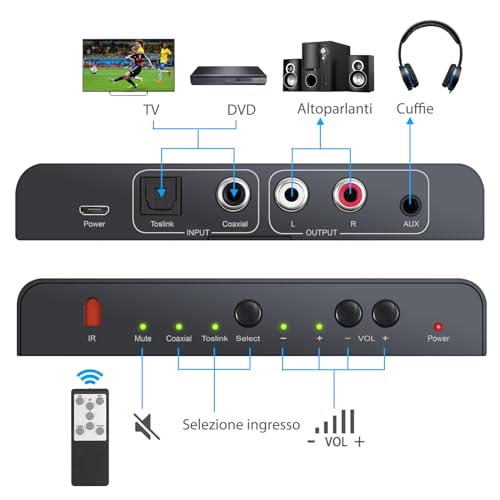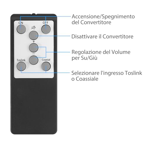 【Telecomando IR】Il Telecomando Wireless IR Può Regolare Facilmente il Volume o Scegliere l'Ingresso / Disattivazione Coassiale o Toslink / Accensione o Spegnimento Utilizzando il Telecomando Wireless IR. Non c'è Bisogno di Lasciare il Comodo Divano.