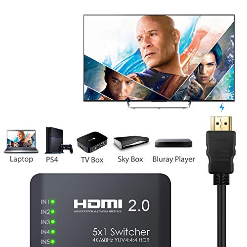 Neoteck 4K HDMI 2.0 Switcher 5 Porte Switch 5 Entrata 1 Uscita Supporta 4K@60Hz YUV 4:4:4 e HDR HDMI con Telecomando IR per Blu-ray PS4 Pro TV Laptop Projector HDTV