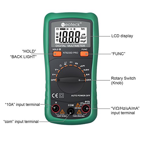 Neoteck PRO MS8233D Multimetro Digitale Auto Range Auto Spegnimento per AC/DC Tensione DC Corrente Resistenza capacità Frequenza Diodo Transistor continuità con LCD Retroilluminazione - Verde