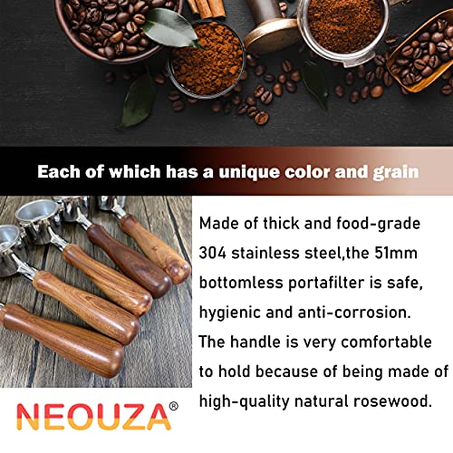 NEOUZA 51 mm Espresso Bottomless Portafilter per Delonghi ECP31.21 ECP33.21 ECP35.31 ECOV 311,304 Cibo Acciaio Inox, Manico in Palissandro, Con Coppa Filtro Cestino