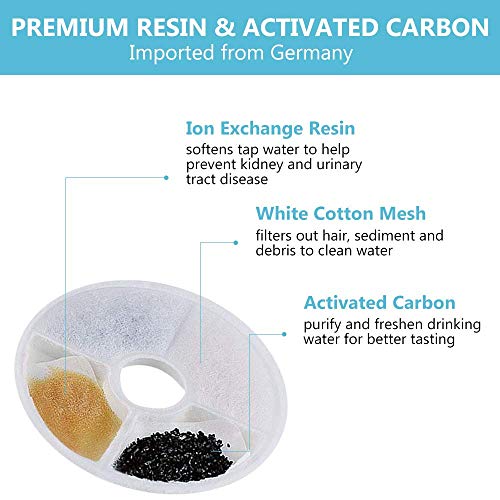 The triple action catit filter contains three different compartments: the ion exchange resin softens the tap water, the activated carbon removes bad odors, and the cotton mesh filters out any sediments the tap water may have