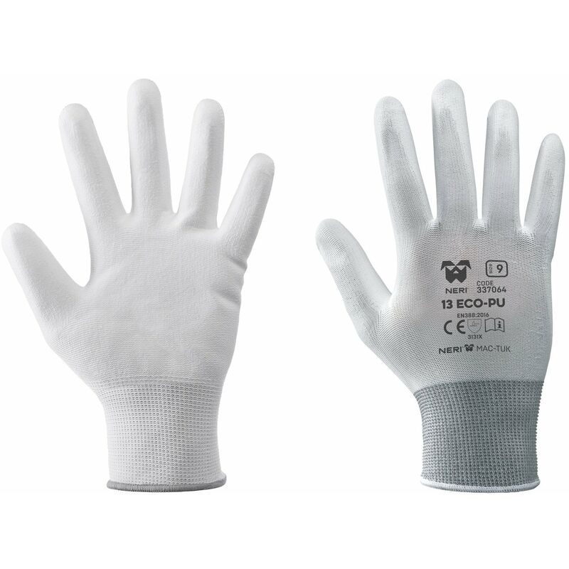 NERI 337064 GUANTI BIANCHI 13 ECO-PU GUANTO DA LAVORO IN POLIESTERE POLIURETANO LA SPECIALE SPALMATURA IN POLIURETANO APPLICATA AL PALMO, COSTITUISCE UNA PELLICOLA DI POCHI CENTESIMI DI MILLIMETRO CHE CONFERISCE AL GUANTO BUONE CARATTERISTICHE DI RESISTENZA MECCANICA PUR MANTENENDO VIVA L'ELASTICITA', VIVA IL COMFORT E LA SENSIBILITA' TATTILE OFFERTE DAL FILATO DI BASE. QUESTI TIPI DI GUANTI NON RILASCIANO PELUCCHI E NON MACCHIANO IL PRODOTTO LAVORATO. SONO ALTAMENTE TRASPIRANTI, PERMEABILI E CONSIGLIATI PER LAVORAZIONI ACCURATE, DI PRECISIONE, ANCHE A LUNGO TERMINE. OTTIMA LA RESISTENZA ALL'ABRASIONE E LA PRESA SIA SU SUPERFICI ASCIUTTE CHE UMIDE, ANCHE IN PRESENZA DI OLI. LA FORMA ANATOMICA DEL GUANTO E LA COMPLETA ASSENZA DI CUCITURE NEI PUNTI DI SFORZO CONFERISCE ALLA MANO NA MAGGIOR SENSAZIONE DI COMFORT E NE RIDUCE L'AFFATICAMENTO SPECIFICHE: Palmo ricoperto in poliuretano Modello economico Massima destrezza e sensibilità tattile Leggero, flessibile, confortevole, con una buona