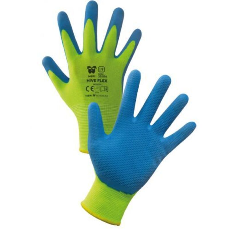 Supporto in poliestere leggero, flessibile e traspirante, per una perfetta vestibilit... e comfort. Spalmatura sul palmo in lattice schiumato con finitura a rilievo (disegno a nido d'ape), per una presa eccellente e propriet... antiscivolo superiori. Il lattice schiumato mantiene la dita flessibili anche a temperature inferiori allo zero. Colore fluo che favorisce l'utilizzo anche in condizioni di scarsa visibilit.... Buona resistenza all'abrasione. Forma ergonomica, assenza di cuciture, ottimo comfort di calzata. Polso elasticizzato e dorso aerato. Colore: blu, giallo fluo.