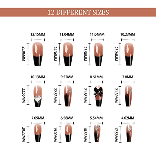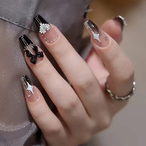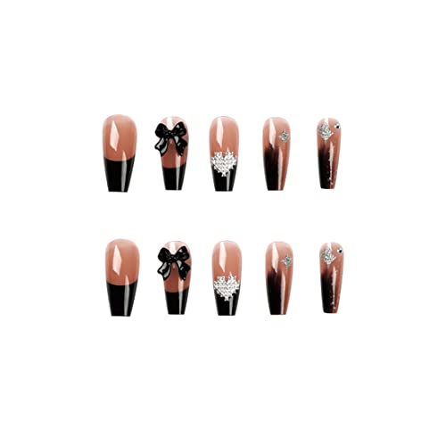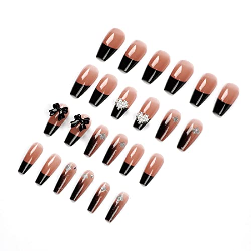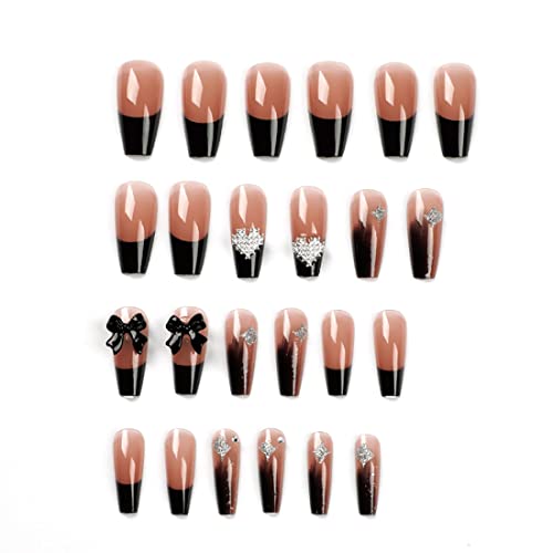 Nero strass unghie finte, 24 Pezzi lucido Bow-nodo unghie false cuore lungo stampa su unghie copertura completa Coffin unghie per le donne e le ragazze decorazione quotidiana