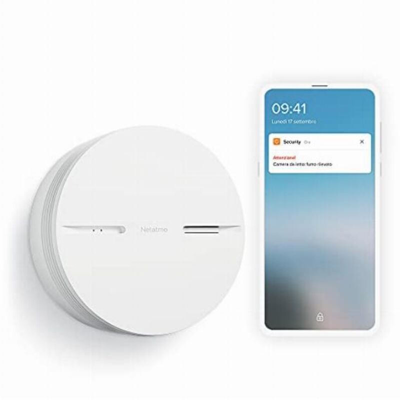 Netatmo Rilevatore di Fumo Intelligente. Tipo di rilevatore: Rilevatore di riflesso fotoelettrico, Colore del prodotto: Bianco, Tipo di montaggio: Montato su superficie. Alimentazione: Batteria, Durata batteria: 10 anno/i. Profondità: 44 mm, Diametro: 11,5 cm. Tipo di imballo: Scatola. Tecnologia di connessione: Wireless, Standard Wi-Fi: 802.11b,802.11g,Wi-Fi 4 (802.11n), Frequenza Wi-Fi: 2,4 GHz