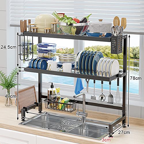 NETEL Scolapiatti da Appoggio Sopra il Lavandino, Antiruggine Scolapiatti sul Lavello Mensola Organizer Salvaspazio a 3 livelli con Portautensili, Porta tagliere per Cucina Nero, Lunghezza 65cm
