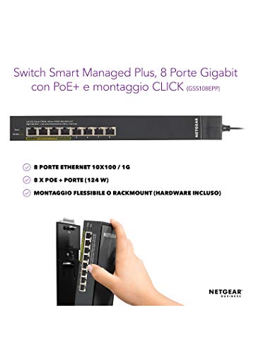 Netgear GSS108EPP Switch PoE Smart Managed Plus a 8 Porte Gigabit Ethernet, con 4 PoE+ a 47 W, Sistema di Montaggio Click Virtually Anywhere