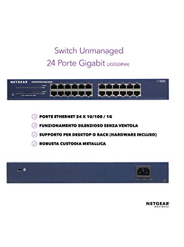 NETGEAR Switch Ethernet 24 porte Unmanaged JGS524, Switch Gigabit con opzioni di Montaggio desktop o su rack e assistenza limitata a vita