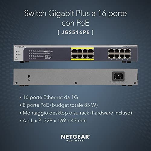 NETGEAR Switch PoE Plus 16 porte JGS516PE, Switch Ethernet Gigabit con 8 PoE a 85 W, montaggio desktop o su rack e assistenza limitata a vita