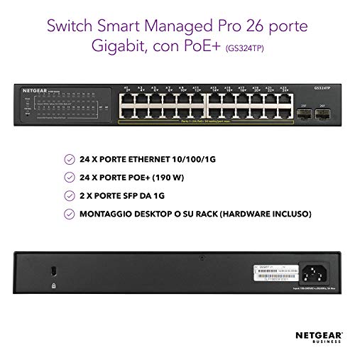 NETGEAR Switch PoE Smart 24 porte GS324TP, Switch Ethernet Gigabit con 24 PoE+ a 190 W, 2 SFP da 1G, montaggio desktop o su rack, serie S350