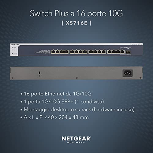 NETGEAR XS716E Switch PoE Smart Managed Plus a 16 Porte Gigabit Ethernet, con 1 SFP+ da 10Gigabit, Montaggio su Desktop/Rack