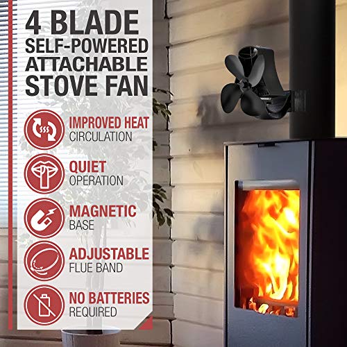 NETTA Ventilatore magnetico per stufa a legna a 4 pale, con fascia regolabile, funzionamento silenzioso, circolazione ecologica, ideale per bruciatore a legna e ventilatore per camino, colore: nero