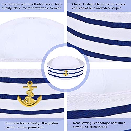 【☸Design Alla Moda】Il cappello da marinaio in generale adotta il classico e alla moda design a strisce blu e bianche. La perfetta combinazione di blu e bianco evidenzia il tema nautico, rendendo questo cappello da marinaio più ordinato e perfetto. Sul davanti del berretto da marinaio è presente una toppa con ancora d'oro Il design e la lavorazione meticolosi rendono il berretto resistente e facile da abbinare.