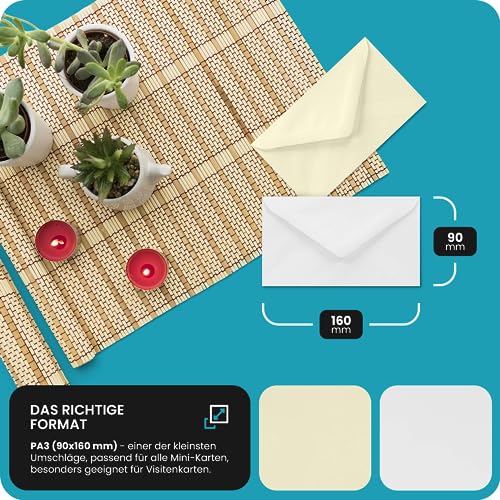 Il formato giusto: a seconda delle esigenze e in particolare a seconda delle dimensioni del contenuto, le dimensioni della busta sono a scelta. C7 (85 x 120 mm), PA2 (90 x 140 mm) e PA3 (90 x 160 mm) sono le buste più piccole, adatte per tutti i mini biglietti, biglietti da visita, ringraziamenti, biglietti aziendali, biglietti regalo, carte bonus, regali in denaro.