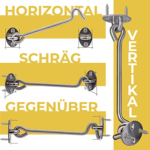 Caratteristiche: il gancio antivento Neuhall è realizzato in vero acciaio inox massiccio. Grazie al diametro di 6 mm è particolarmente resistente alle intemperie, alla ruggine e ha una lunga durata. Pertanto, i nostri ganci antivento possono essere utilizzati anche senza complicazioni in ambienti esterni.