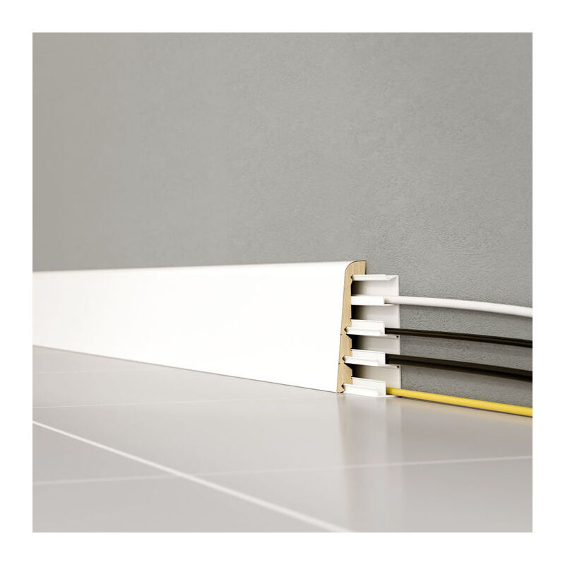 Battiscopa MDF Bianco con passafili in lamiera compreso per far ordinare fili e cavi in modo facile e comodo. Questo battiscopa MDF bianco perfetto per chi ha molti cavi elettrici da nascondere. Il profilo dispone di 4 guide per ospitare 4 fili con diametro massimo di 9 mm. Inoltre il battiscopa pu essere segato nelle scanalature interne per avere cos diverse altezze, a seconda del bisogno. Stessa cosa verr fatta per il profilo passafili Il materiale rende il battiscopa particolarmente flessibile rispetto al vero legno, quindi adatto anche a muri non perfettamente dritti. Inoltre il rivestimento in carta melaminica molto pi resistente ad urti o graffi rispetto al legno. DIMENSIONI Spessore: 24 mm Altezza: 92 mm CONFEZIONE RISPARMIO 24 ML (10 Aste da 2,4 ml) Dimensioni dell'accessorio passafili: 19x81,5 mm POSA Il battiscopa MDF bianco viene agganciato al profilo che, a sua volta, viene fissato al muro con delle clip acquistabili nella sezione Accessori. MANUTENZIONE Non posare il