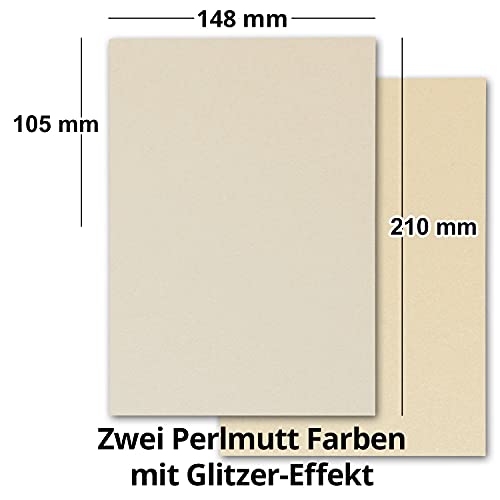 Un set di 2 diversi sobrio crema. Le carte e le buste hanno un effetto madreperla scintillanti. Color crema chiaro e scuro madreperla (bianco ghiaccio)//Include una hochwertiken/scatola regalo in un colore casuali (ad esempio di Artoz Pure)