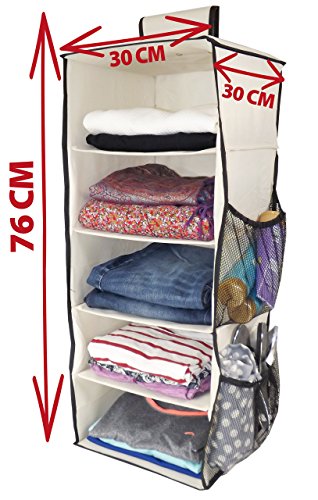 Neusu Contenitore Per L'organizzazione Da Appendere Nel Guardaroba - 5 Ripiani Più 4 Tasche Laterali - Stoffa Robusta 600D - 30cm x 30cm x 76cm (65+ lt. di volume) - Beige