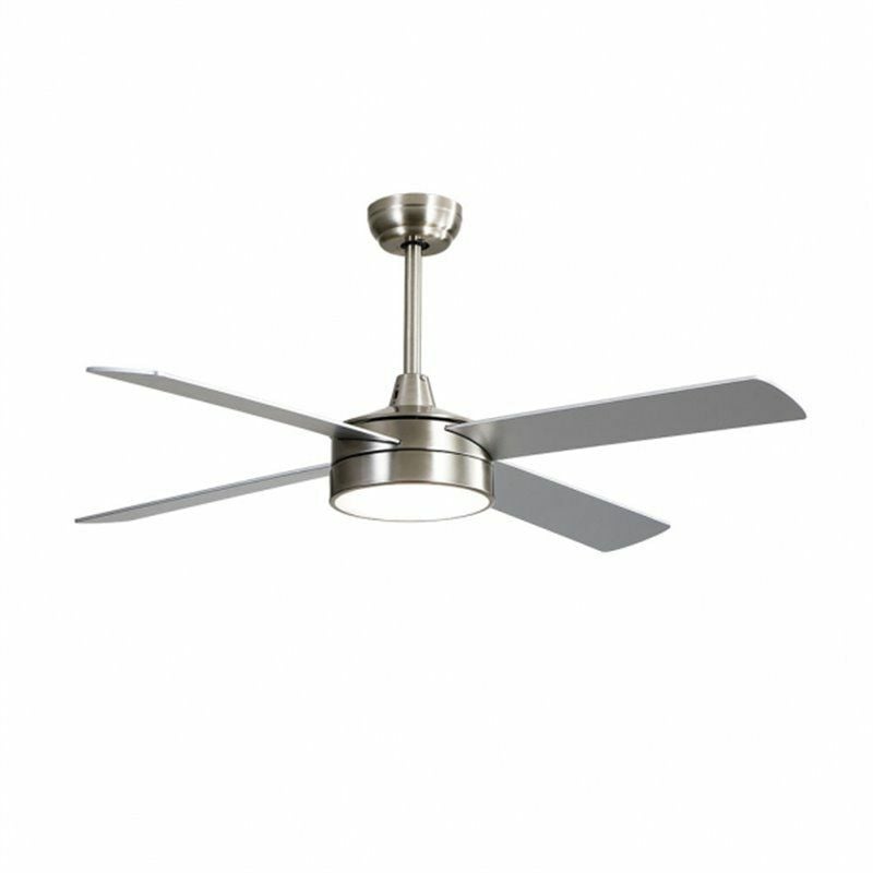 Ventilatore NEVERY in metallo, MDF e policarbonato, colore NICKEL con QUATTRO pale REVERSIBILI colore FAGGIO/ARGENTO. Ha tre velocità regolabili. Tecnologia LED integrata dalla potenza di 24W, con 3 TEMPERATURE LUCE (3000-4000-6000K) e 2950 lumen. La s
