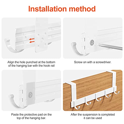 【Facile da installare】 L'installazione è molto semplice, basta allineare la parte inferiore della barra di sospensione con la posizione della guida del gancio, avvitarla con un cacciavite, attaccare il cuscinetto protettivo sulla parte superiore della barra di sospensione e poi tu può facilmente appenderlo alla fessura della porta o alla porta dell'armadio per l'uso. sfruttando appieno lo spazio sulla porta, trasformando la porta in una decorazione domestica.