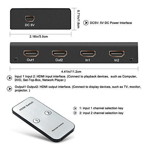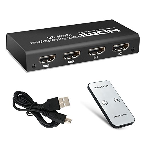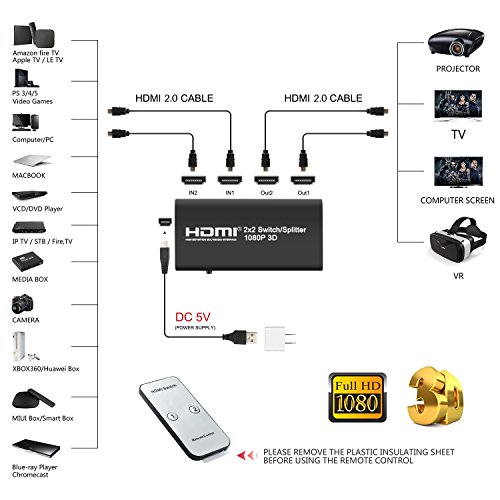 NewBEP 2 x 2 splitter HDMI Switch, Switcher con IR telecomando e alimentatore di rete USB, supporto 3D Full HD 1080p HDCP 1.3 per Apple TV computer PS3 PS4 MacBook lettore Blu-Ray DVD Player