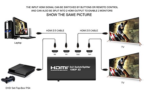 Versione di aggiornamento, multifunzione. Non solo uno splitter HDMI, aslo un HDMI SWITCHER.Dispone di 2 ingressi HDMI, 2 uscita HDMI, trasmettere video e audio contemporaneamente, senza perdita di segnale, senza alcun ritardo.