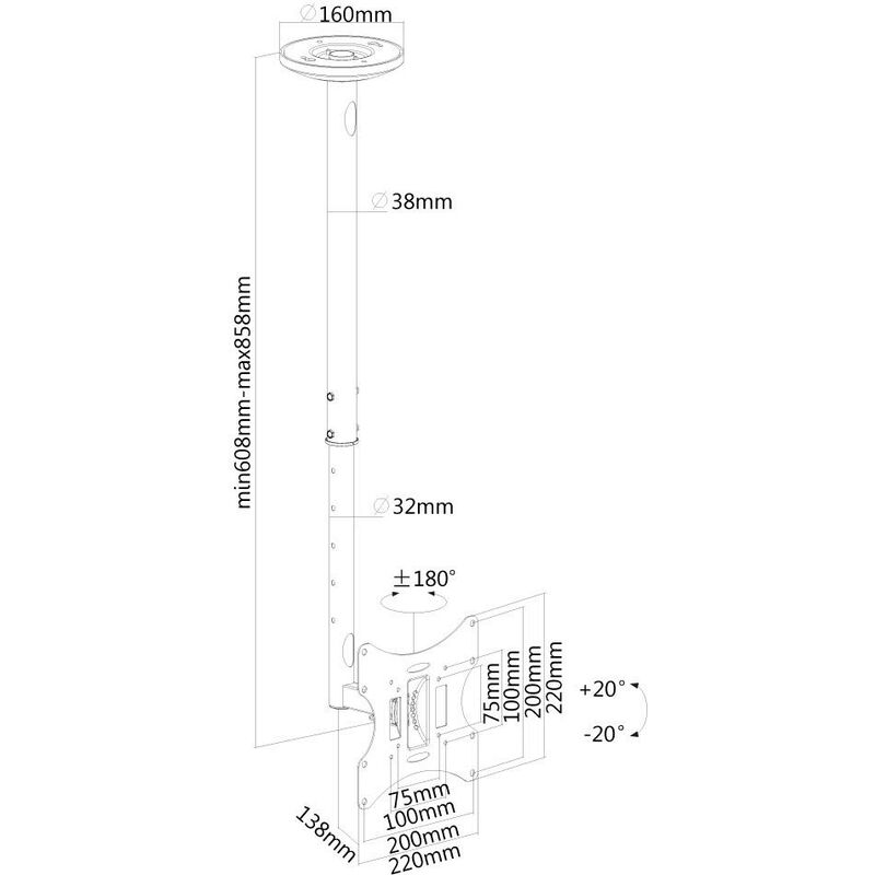 Descrizione del prodotto. Questo NewStar LCD / LED / montaggio a soffitto TFT FPMA-C060BLACK, consente di montare uno schermo a soffitto. Questo modello consente agli utenti di ruotare, sollevare, inclinare e ruotare il display LCD per la massima efficienza e comodità. Il supporto a soffitto può essere facilmente fissato al retro dello schermo utilizzando la foratura VESA universale di 75/100/200. Se la foratura è diversa, acquistare una delle nostre piastre di conversione VESA. Contenuto della confezione Manuale, kit di montaggio