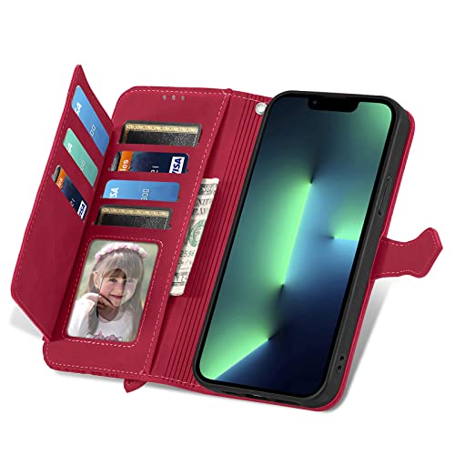 NEXCURIO Custodia a Libro Cover Portafoglio per Apple iPhone 12 / iPhone 12 Pro Flip Case in Pelle Fiori Donna con Tasca Zip Porta Carte Laccio Supporto Antiurto - Rosso