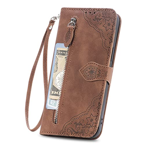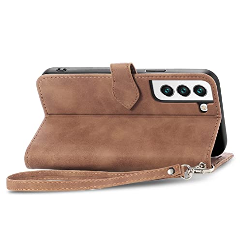 NEXCURIO Custodia a Libro Cover Portafoglio per Samsung Galaxy S22 5G Flip Case in Pelle Fiori Donna con Tasca Zip Porta Carte Laccio Supporto Antiurto - Marrone