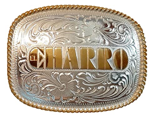 Fibbia EL CHARRO silver con tema floreale, scritta EL CHARRO centrale in rilievo colore oro, bordo colore oro, dimensioni 9 cm x 7 cm, montabile su tutte le nostre cinture con fibbia removibile.