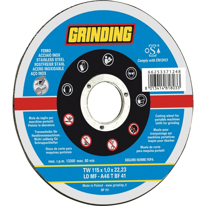 Mod. 'tw-ldmf' resinoidi rinforzate piane. per applicazioni nell industria di acciaio inox e ferro e per il taglio di lamierati e particolari in acciaio e acciaio inox. foro 22,2 mm diametro 230 mm spessore 1,9 mm