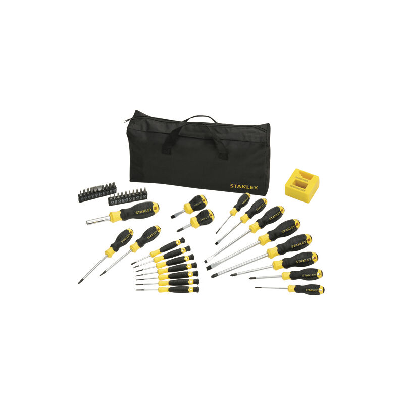 In acciaio al cromo vanadio, impugnatura bi-material, indicazione del tipo di punta sull'impugnatura. contenuto: 5 giraviti standard, 5 giraviti phillips, 2 giraviti torx, 7 giraviti di precisione, 1 giravite porta inserti multi bit, 20 inserti lungh.25 m