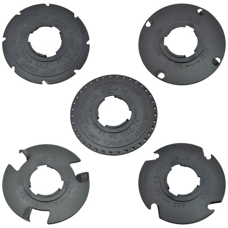 In kit. composizione: 1 disco per carotine/lattuga/rapa/cavolo e semina fine, spaziatura 11,4 cm, 1 disco per broccoli/cavolo cappuccio/cavolfiore, spaziatura 2,5 cm, 1 disco per cetriolo/zucche/zucchine e semi piatti, spaziatura 22,9 cm, 1 disco per pop