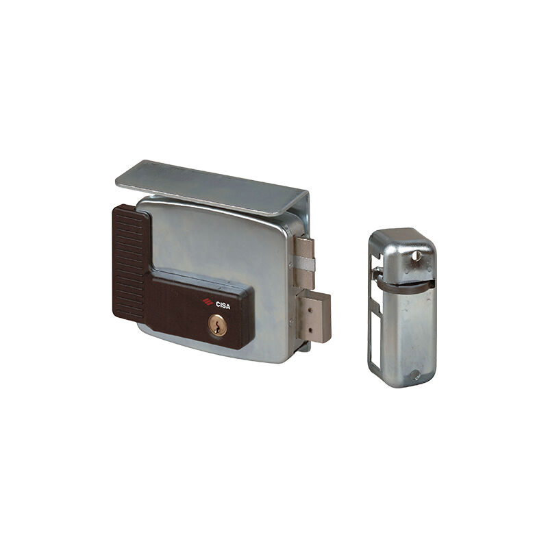 In acciaio zincocromato, per serramenti metallici, con scrocco autobloccante e due mandate, cilindro interno ed esterno fisso, tettuccio protettivo zincato in dotazione. entrata mm. 60