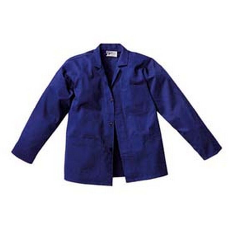 Tessuto 100% in cotone sanforizzato colore blu, peso gr.280 mq. - restringimento +/- 5% - collo e bavero in doppio tessuto, chiusura con bottoni, 1 taschinio applicato sul petto e 2 tasche applicate in vita