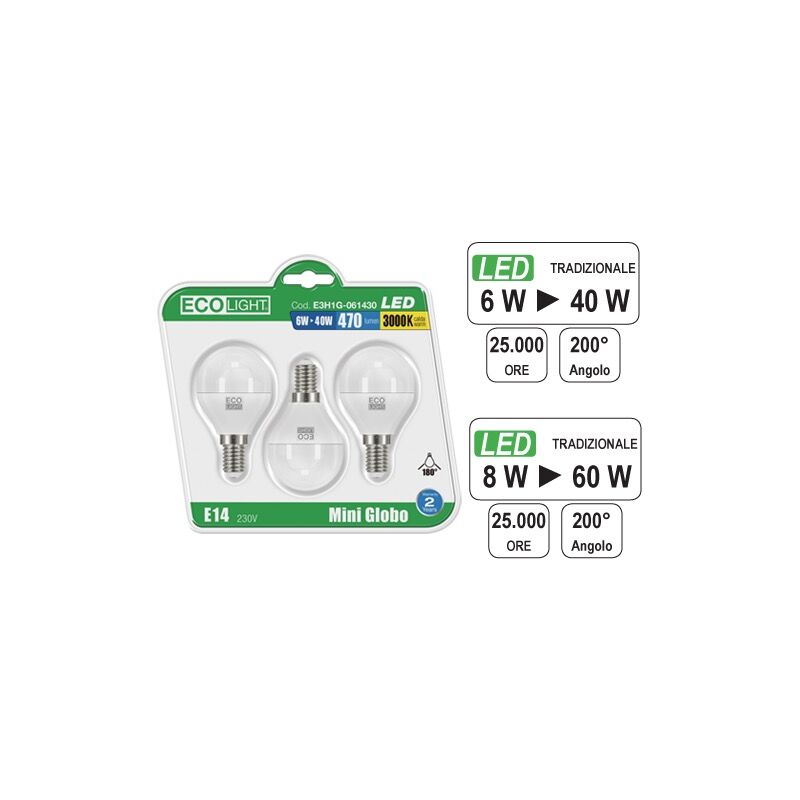 Tecnologia led in classe a+. consumi ridotti al 90%. attacco e14. confezione 3 pezzi. 8 watt 6400k luce fredda 806 lumen